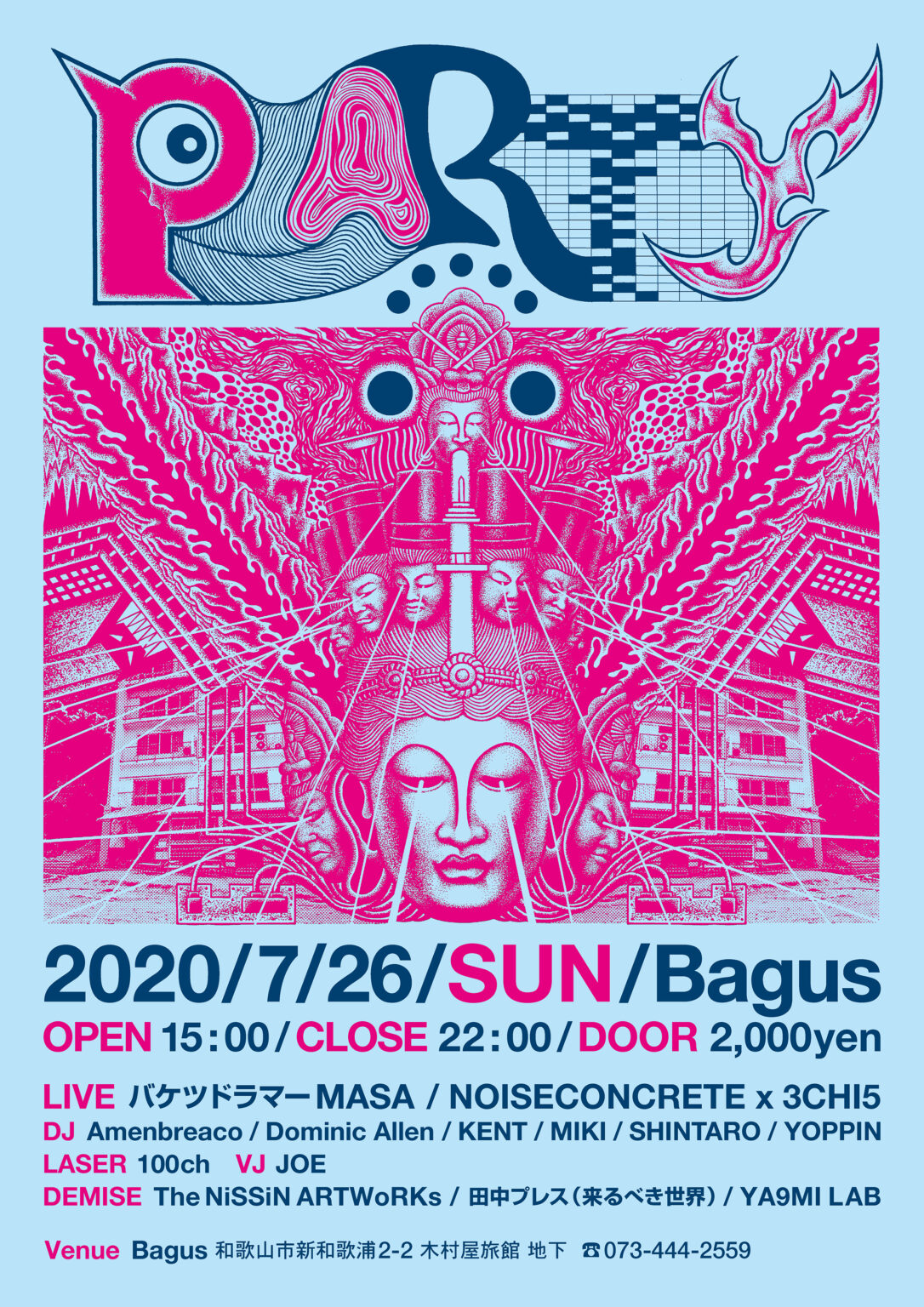 バケツや廃材などでドラムセットを組み上げ、塩ビパイプをディジュリドゥにして奏でるアーティスト・バケツドラマーmasa氏出演のイベント「Party」のためのデザイン。「PARTY」はメインとなる絵を描いてからコラージュして制作。缶バッジもあり。「PARTY!!」は、バケツドラマーにヨーロッパの呪術的なイメージを組み込み制作。