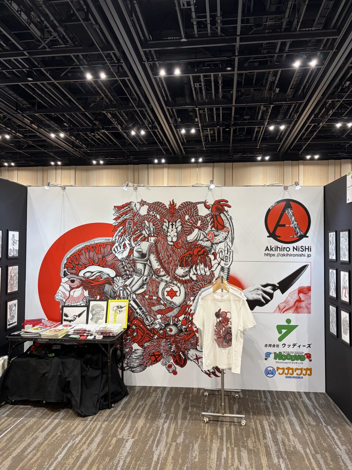 This art exhibition, held at Osaka’s Umeda South Hall, featured over 100 artists and galleries from nine countries including Japan, Indonesia, Malaysia, Taiwan, Thailand, South Korea, India, the Philippines, and the United States. Akihiro Nishi exhibited his art books, original artwork, and printed T-shirts.